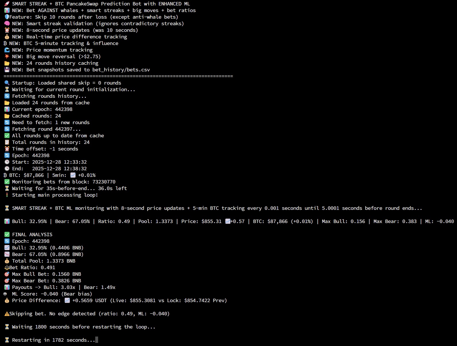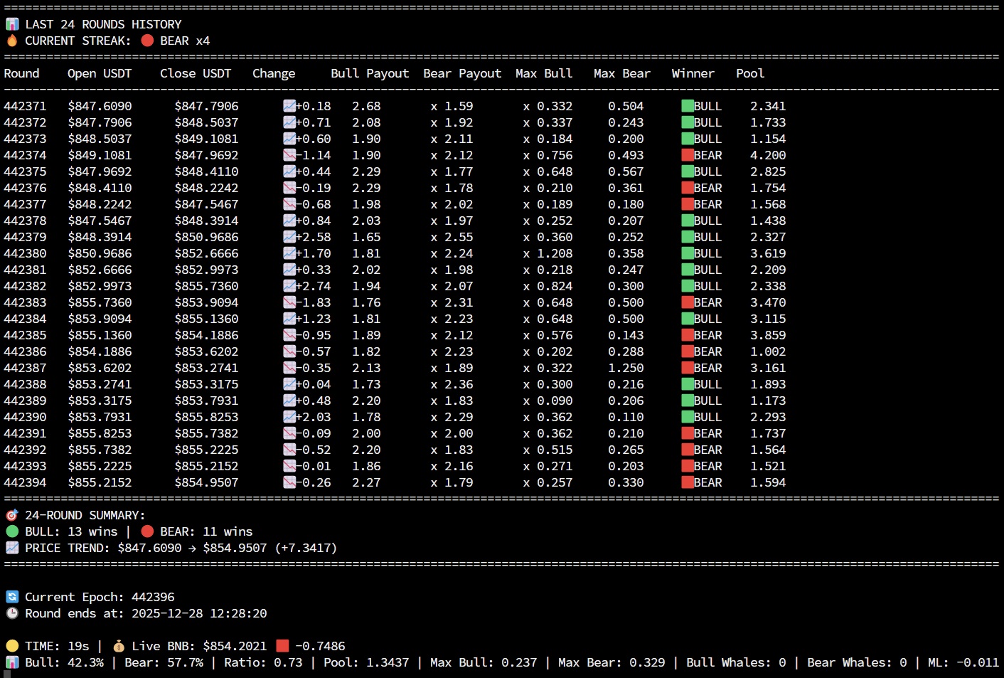 The bot automatically places bets on whether BNB price will go UP (Bull) or DOWN (Bear) in 5-minute prediction rounds, using machine learning insights and market analysis.