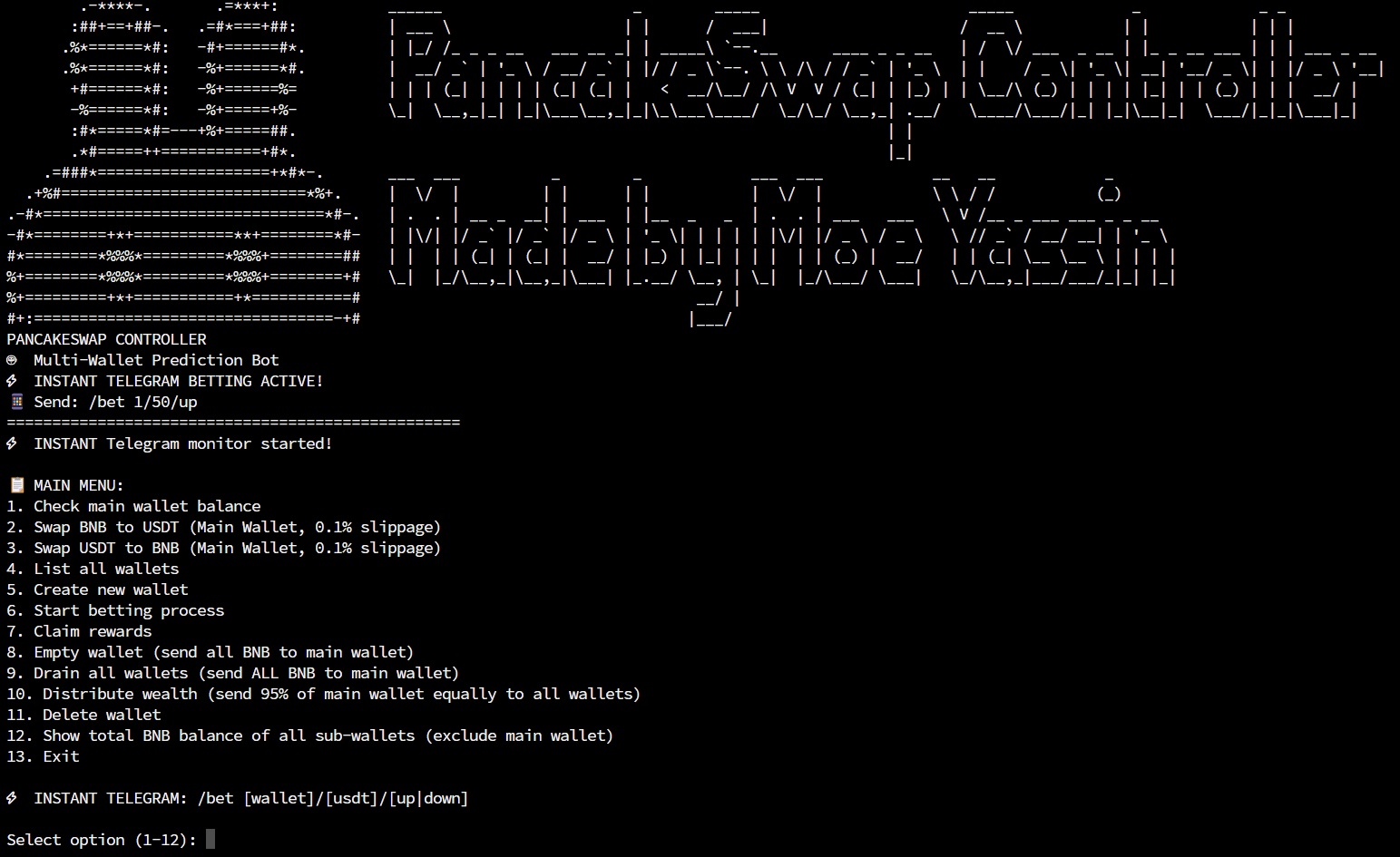 This is a comprehensive wallet management and betting system for PancakeSwap predictions with instant Telegram betting capabilities.